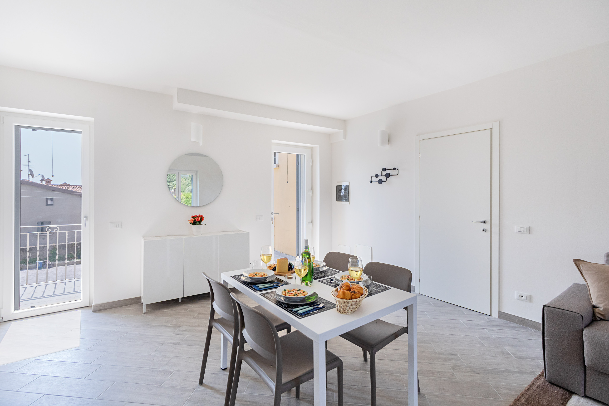 From the living room windows you can access the wonderful covered terrace, furnished with a table and chairs for outdoor breakfasts and dinners, as well as a comfortable lounge area with sofas from which to admire Lake Garda.