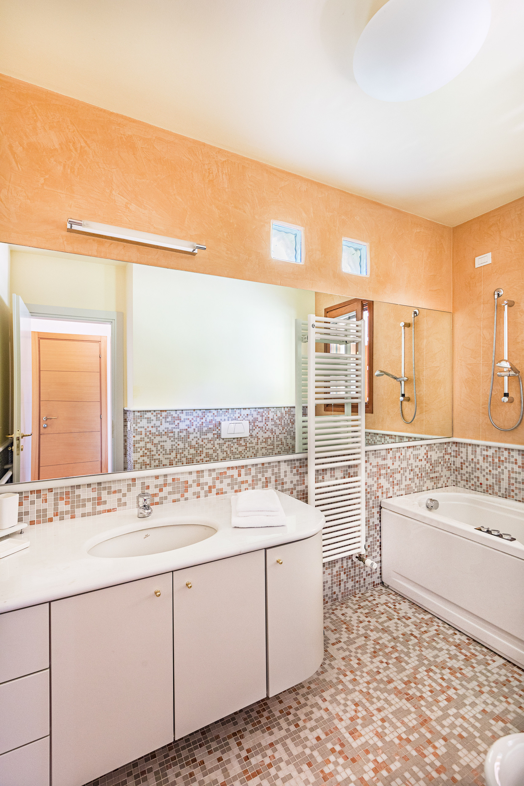 On the ground floor, additional spaces give Villa Vittoria an impressive sense of size and comfort. Here you will find two spacious suites with a double bed, sofa, armchair, and wardrobes. Each suite includes a private en-suite bathroom with shower, sink, bidet, and toilet. The ground-floor rooms have a French door overlooking the inner side of the property.