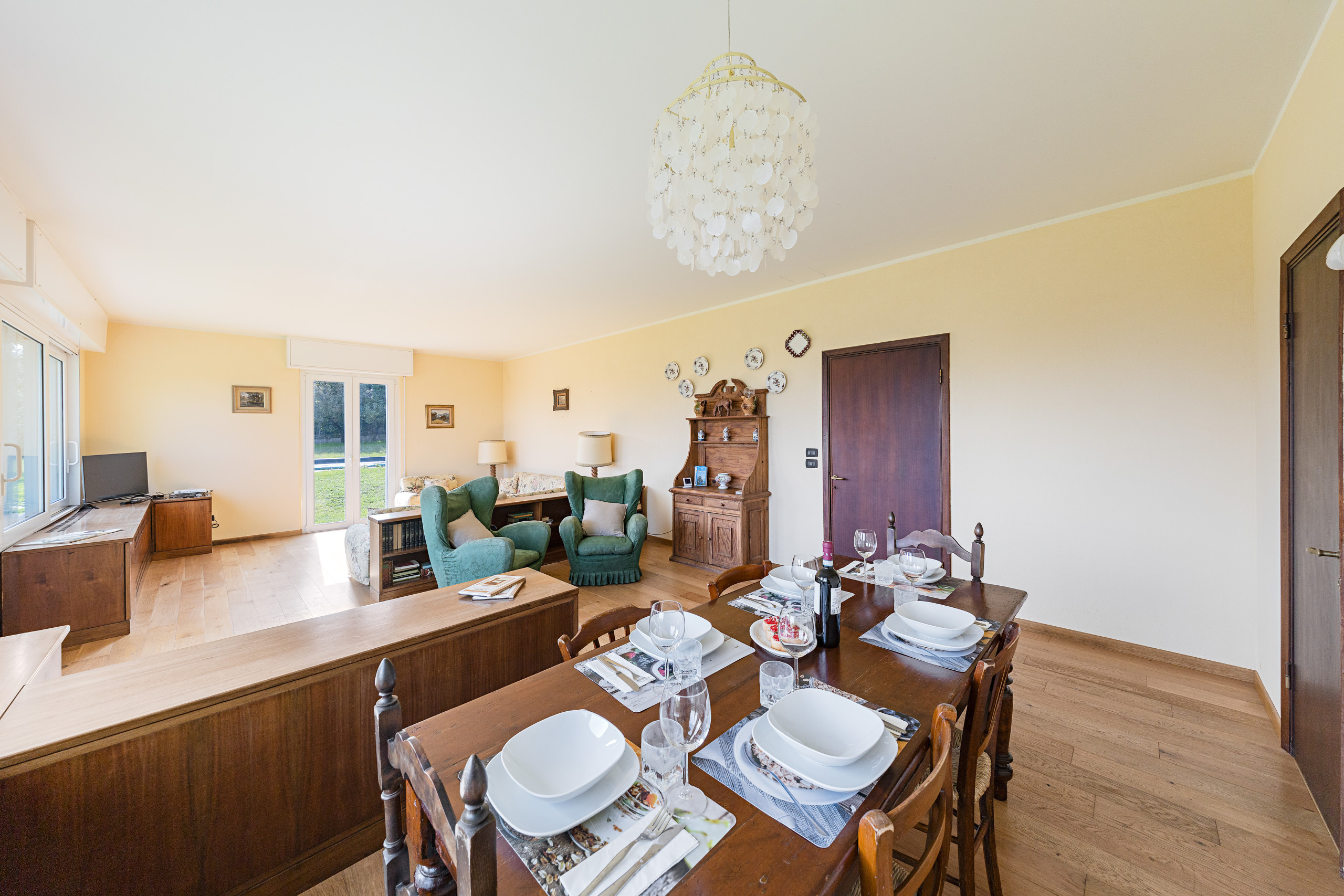 The villa, equipped with Wi-Fi internet connection, welcomes guests with a spacious and bright living room featuring sofas, Smart TV, and a dining table with chairs; the kitchen is separate from the living room and includes an induction hob, refrigerator, freezer, microwave, dishwasher, electric kettle, citrus juicer, coffee machine, and toaster.