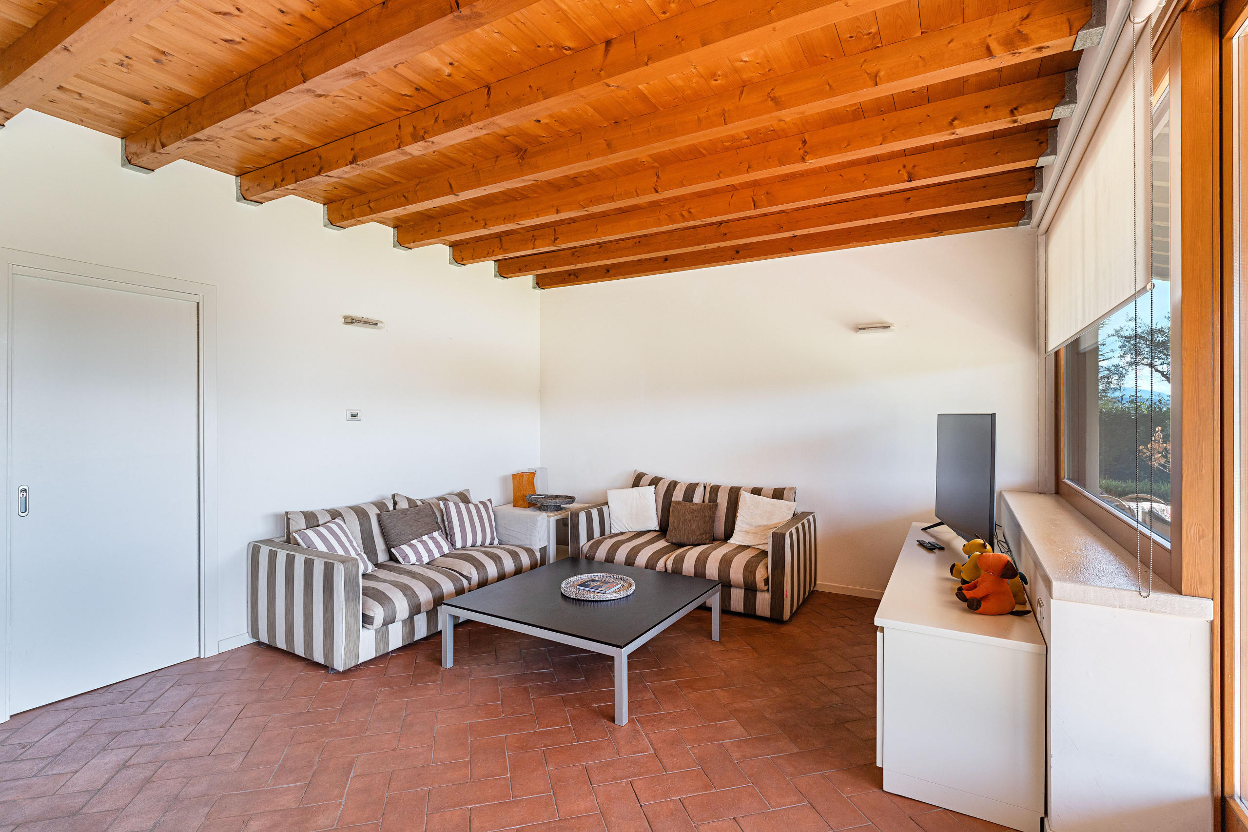 At the entrance, the villa welcomes guests with a spacious living room featuring exposed beams, two sofas, a Smart TV, a dining table with chairs, and an open-plan kitchen equipped with a gas stove, refrigerator, freezer, oven, American coffee machine, microwave, dishwasher, electric kettle, and toaster. A French door leads to the covered patio, elegantly furnished with an outdoor dining table and chairs, where there is also a barbecue area, and to the large garden with a swimming pool.