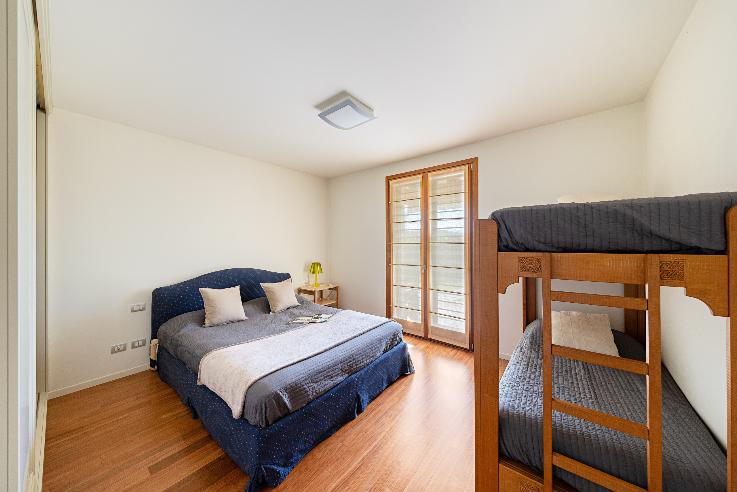 The ground floor continues with a bathroom equipped with a shower, sink, bidet, and toilet, and a sleeping area with three bedrooms: the first room has a double bed, wardrobe, Smart TV, and an ensuite bathroom with shower, sink, bidet, and toilet; the second bedroom has a double bed, a bunk bed, and a wardrobe; finally, the third bedroom also has a double bed, Smart TV, and a large wardrobe.
