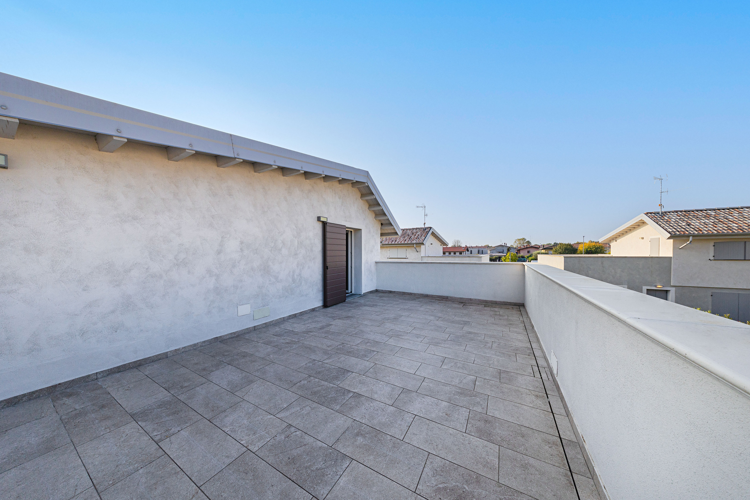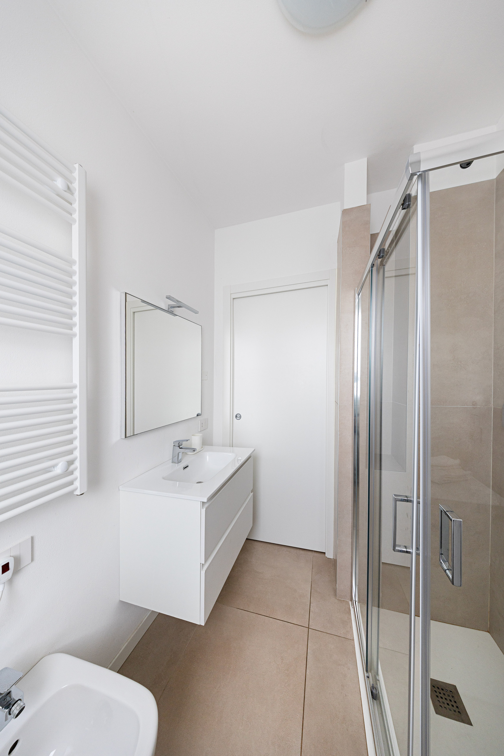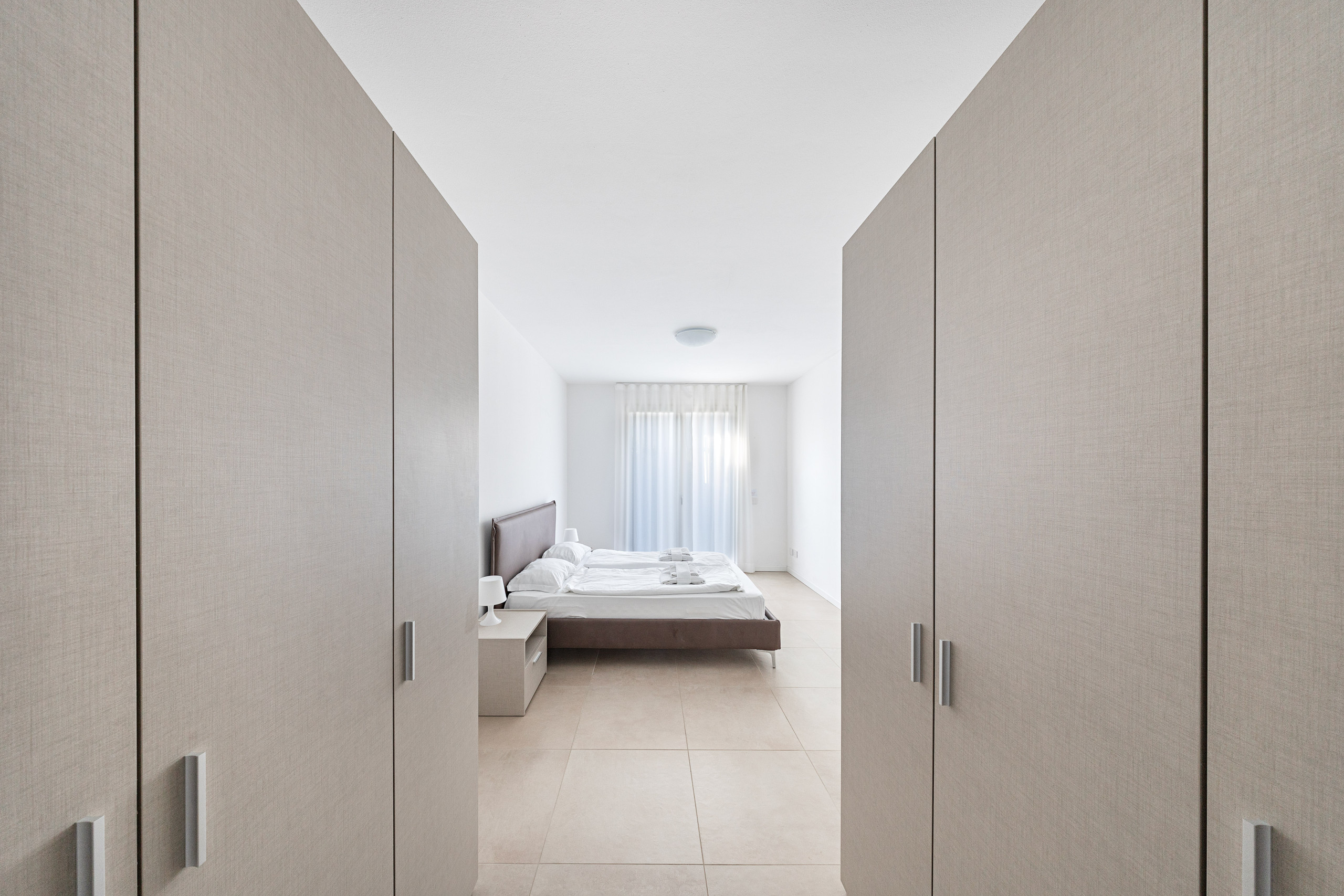 The sleeping area consists of three bedrooms. The master suite features a double bed, a spacious wardrobe, and a private bathroom with shower, washbasin, bidet and toilet. The second bedroom also offers a double bed and a wardrobe, and benefits from access to the ground-floor bathroom equipped with shower, washbasin, bidet and toilet. On the upper floor is the third double bedroom, with flat-screen TV, walk-in wardrobe, en-suite bathroom with shower, washbasin, bidet and toilet, and direct access to the villa’s private rooftop terrace.