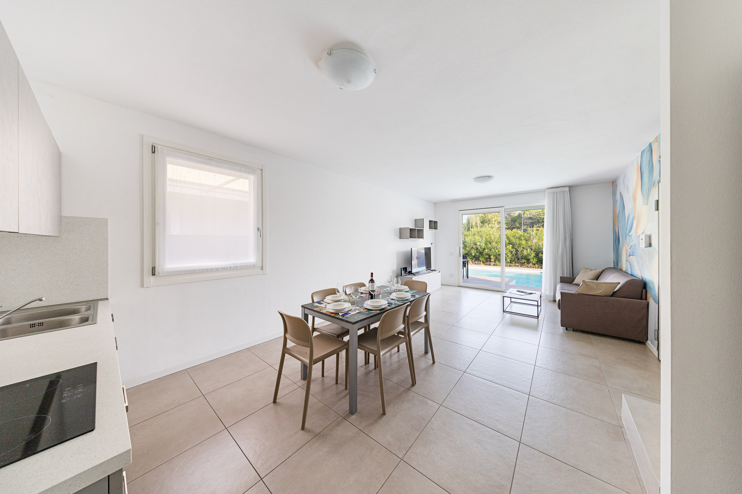 This charming property welcomes guests into a spacious and bright living room, furnished with a comfortable double sofa bed, dining table with chairs, Smart TV, and a modern open-plan kitchen fully equipped with an induction hob, refrigerator, freezer, oven, microwave, dishwasher, electric kettle, juicer, toaster and American coffee machine. A large French window leads to the private porch, furnished with an outdoor table and chairs, ideal for al fresco dining with a view of the exclusive-use swimming pool.
