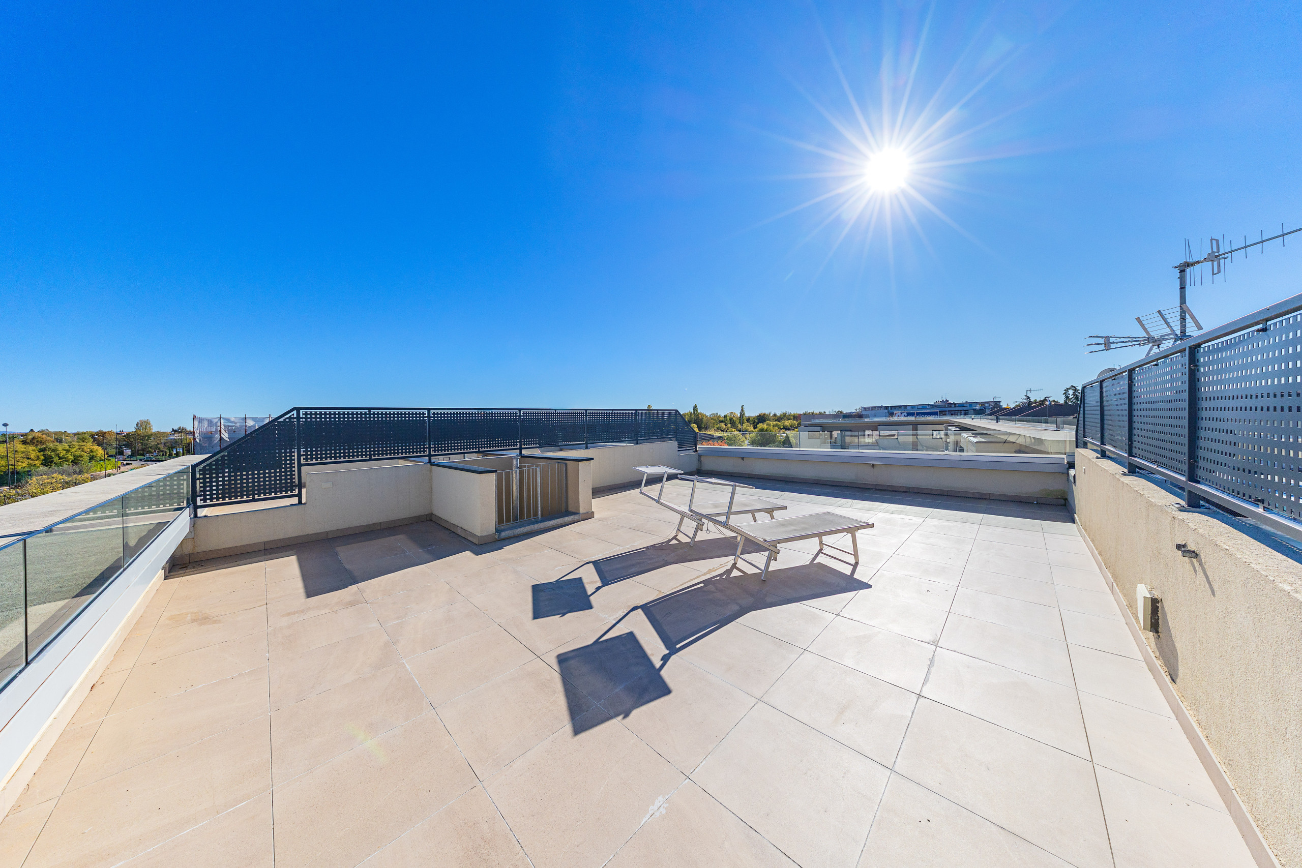 Desde el salón se accede a un pequeño balcón que, mediante una escalera, conduce a la terraza solárium privada en la azotea del residencial.