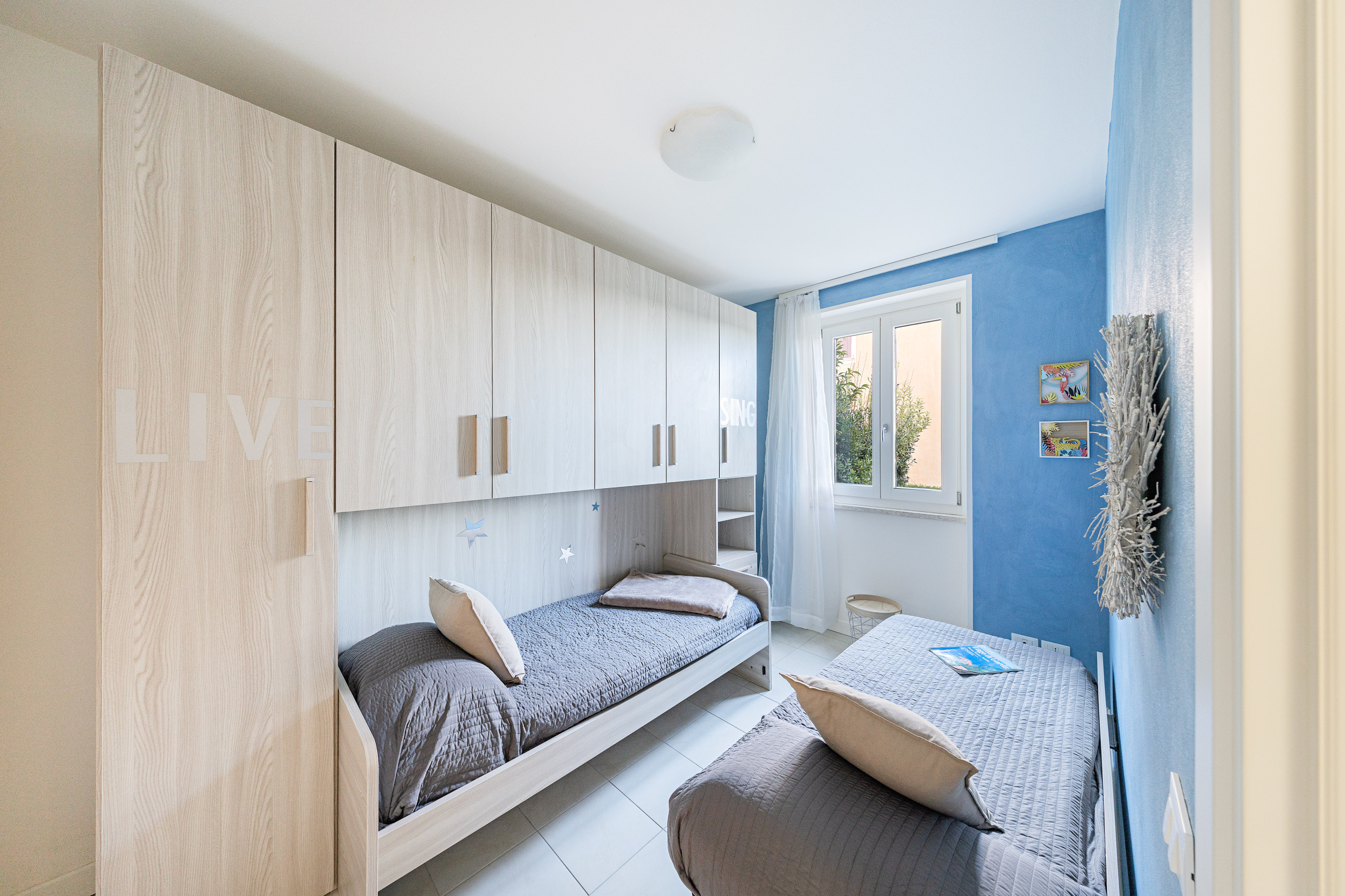 La distribución continúa con el dormitorio principal, equipado con cama doble y amplios armarios. También dispone de un baño con ducha, lavabo, WC y bidé, y un segundo dormitorio con una cama individual y una cama individual extraíble, completando el diseño de este apartamento amplio y cómodo, ideal para unas vacaciones relajantes en el Lago de Garda.