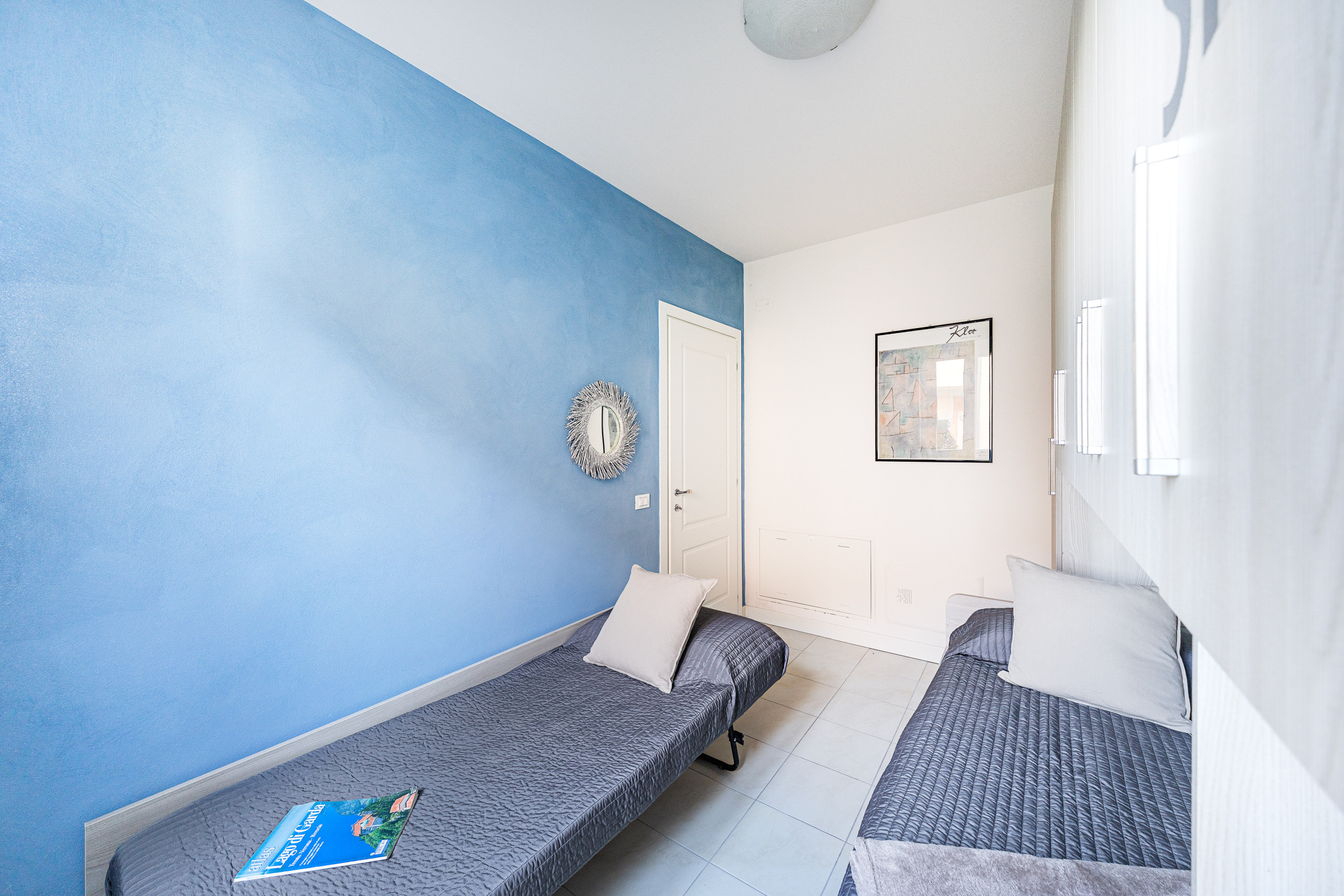 El apartamento continúa con el dormitorio principal, equipado con cama doble y amplios armarios. El baño, con ducha, lavabo, WC y bidé, y el segundo dormitorio con litera completan la distribución de este amplio y confortable apartamento, ideal para unas vacaciones relajantes en el Lago de Garda.