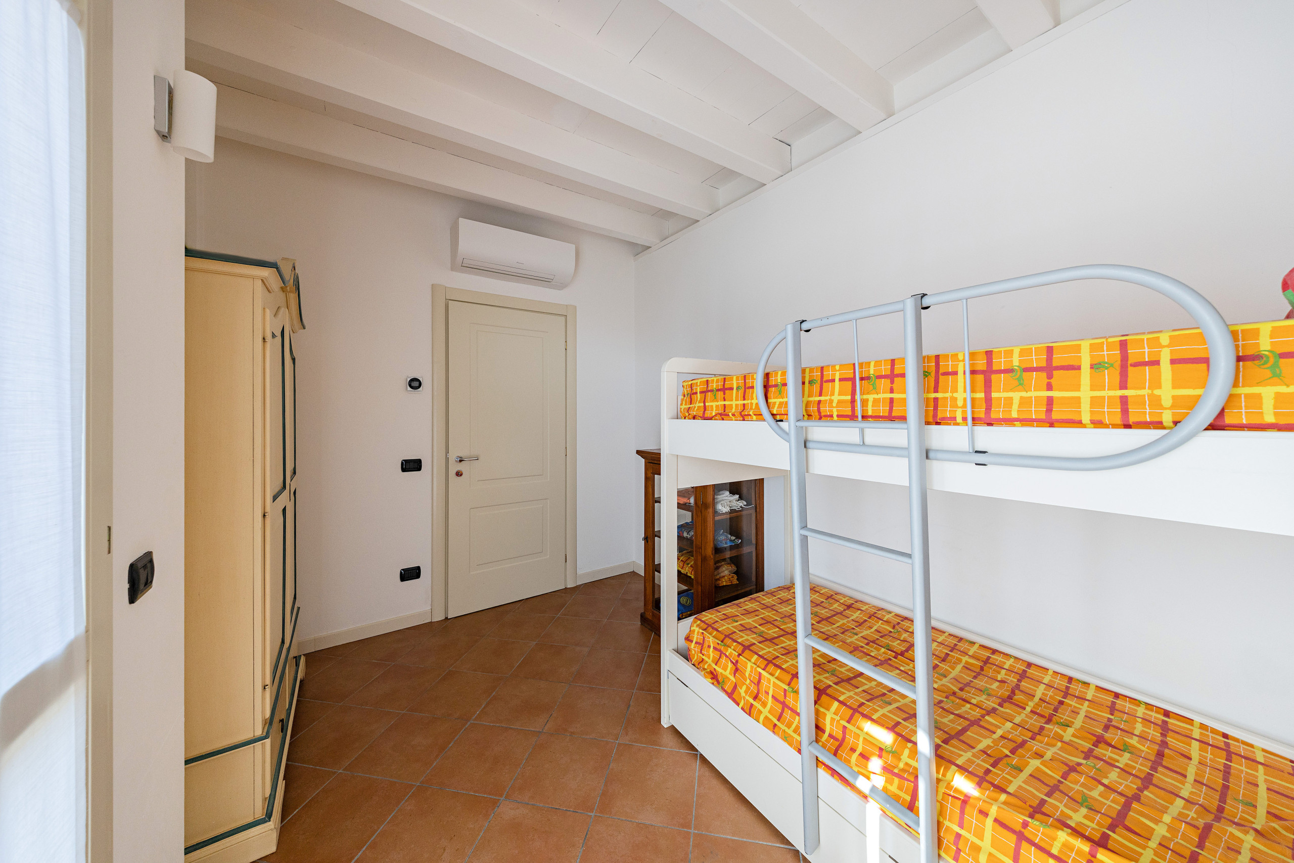 La zona de noche incluye un amplio dormitorio doble con armario (accesible mediante tres escalones), un segundo dormitorio con litera y un baño completo con ducha, lavabo, bidé y WC. Los huéspedes también disponen de lavadora, tabla y plancha. El apartamento incluye un garaje privado para un coche.