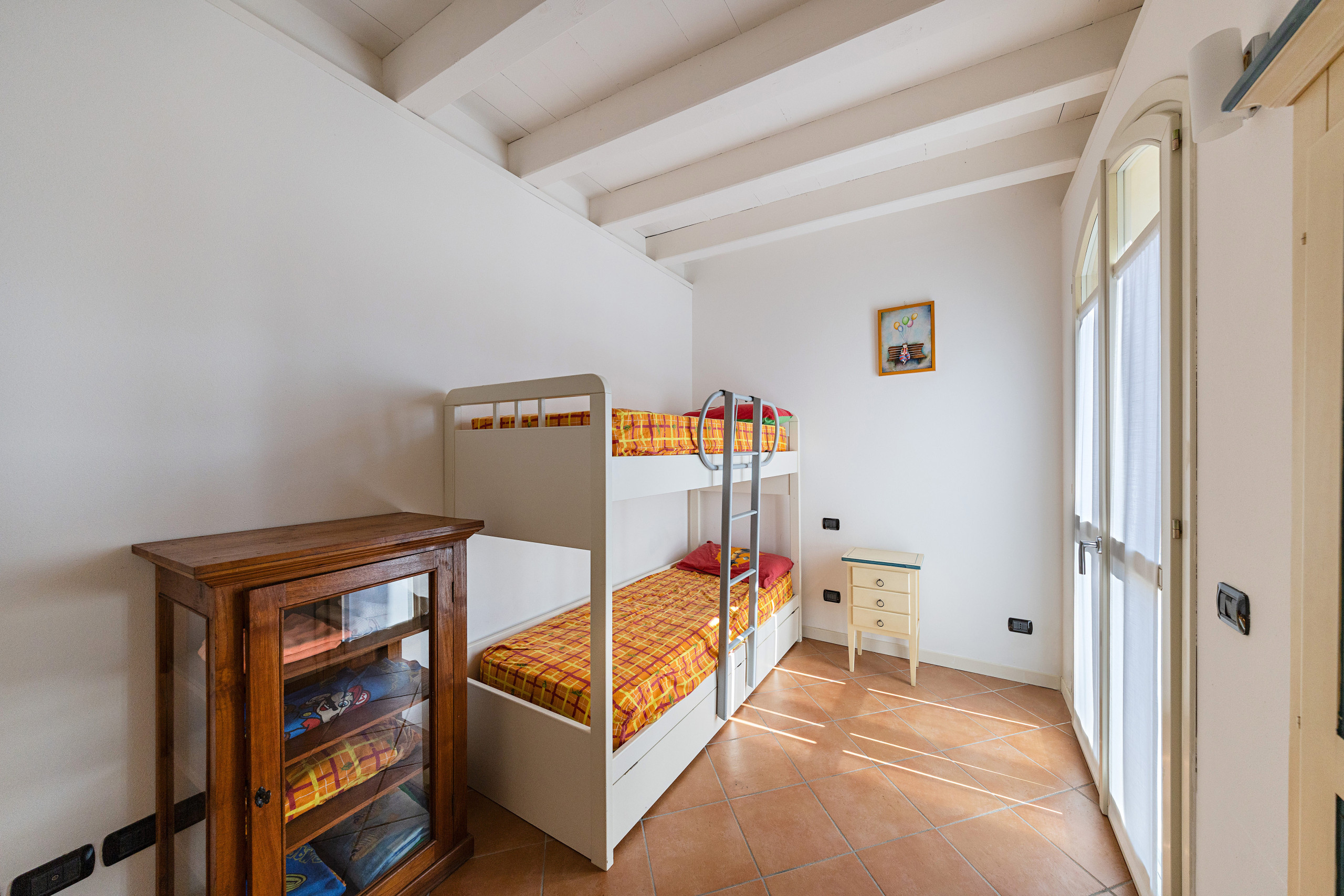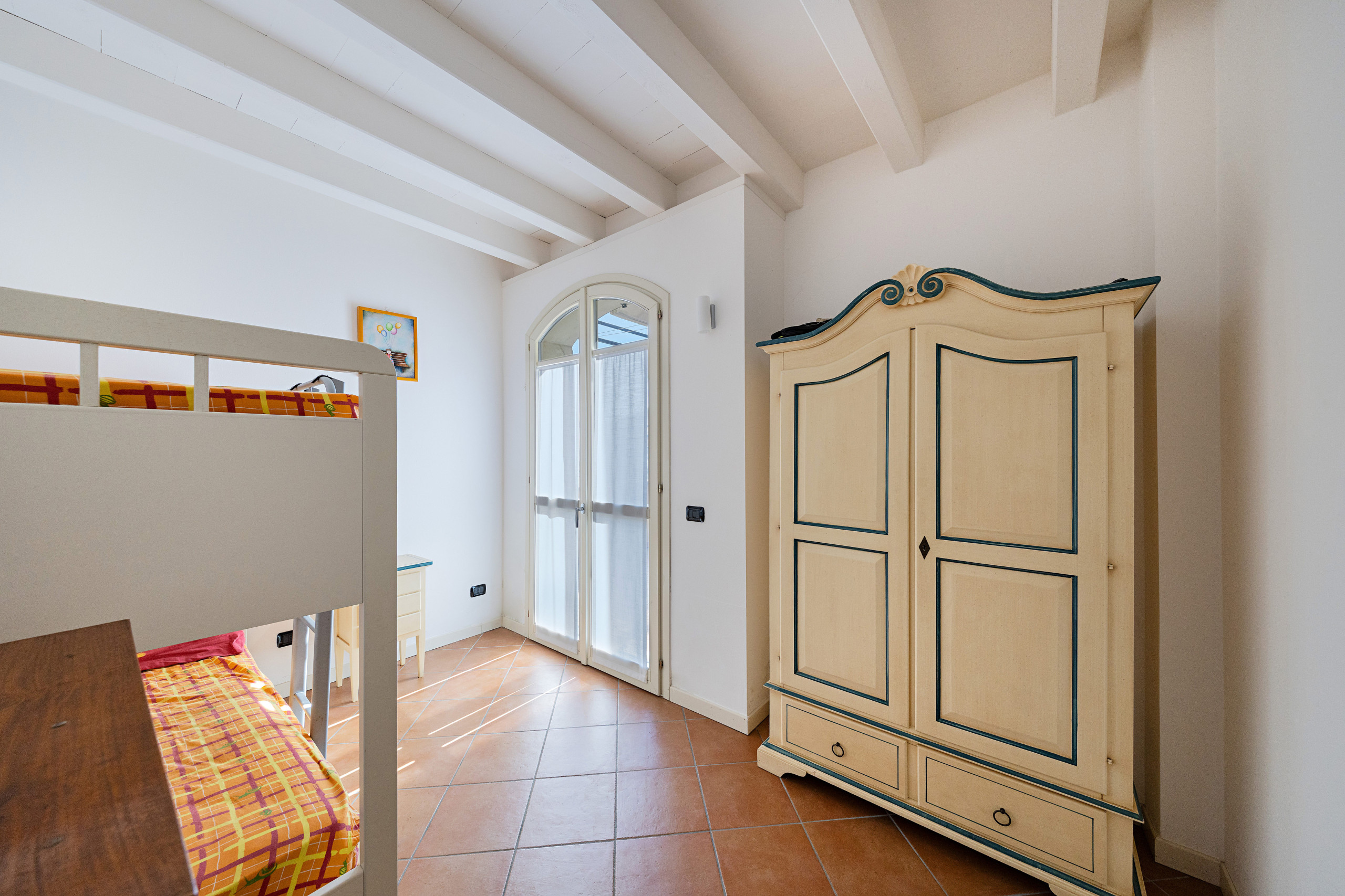 El salón se abre a un bonito patio cubierto por un toldo y al jardín, desde donde se disfruta de una magnífica vista del lago; el patio está equipado con mesa de comedor y sillas de exterior. El apartamento continúa con un dormitorio doble, un segundo dormitorio con dos literas y un baño con ducha, lavabo, bidé, WC y lavadora.