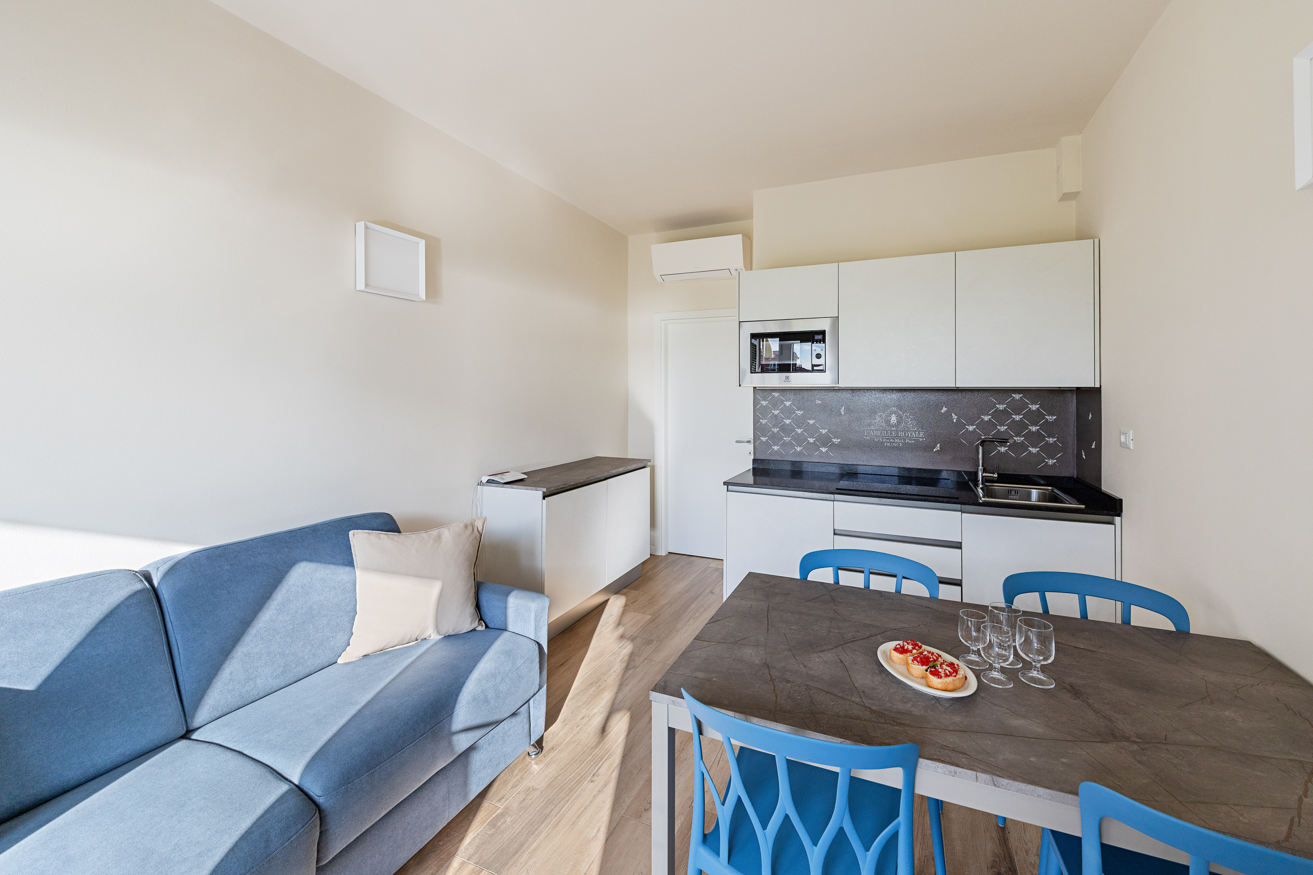 El apartamento, equipado con conexión Wi-Fi gratuita y aire acondicionado en todas las habitaciones, recibe a los huéspedes con un salón con sofá cama doble, mesa de comedor con sillas, Smart TV y cocina americana completa con placa de inducción, microondas, nevera, congelador, cafetera, hervidor eléctrico y tostadora. El salón da acceso a un balcón cubierto con mesa de exterior, desde donde se puede disfrutar de una maravillosa vista al lago y al parque de la residencia.