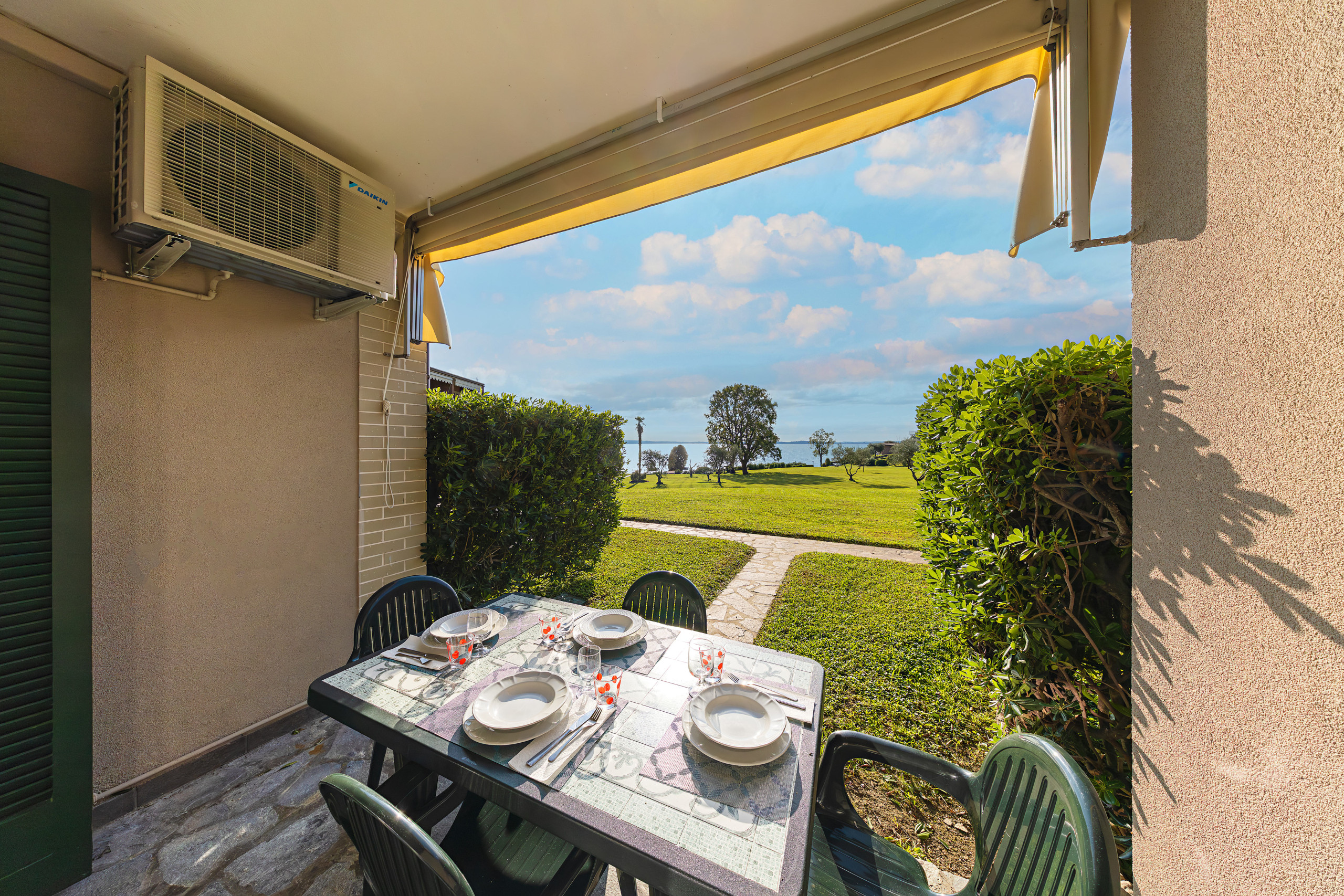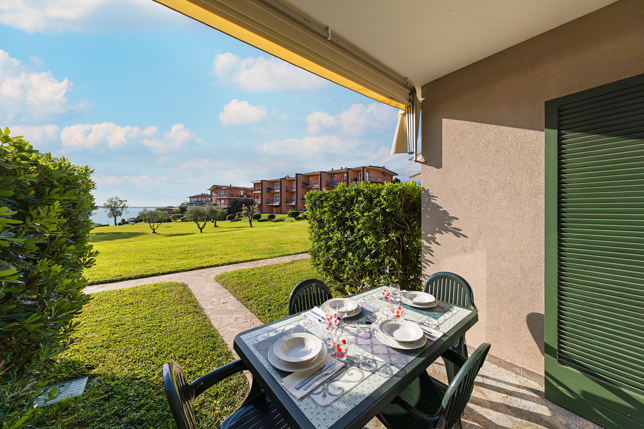 Desde el salón se accede a un porche cubierto con mesa exterior, desde donde se puede disfrutar de una hermosa vista al lago y al parque del residence.