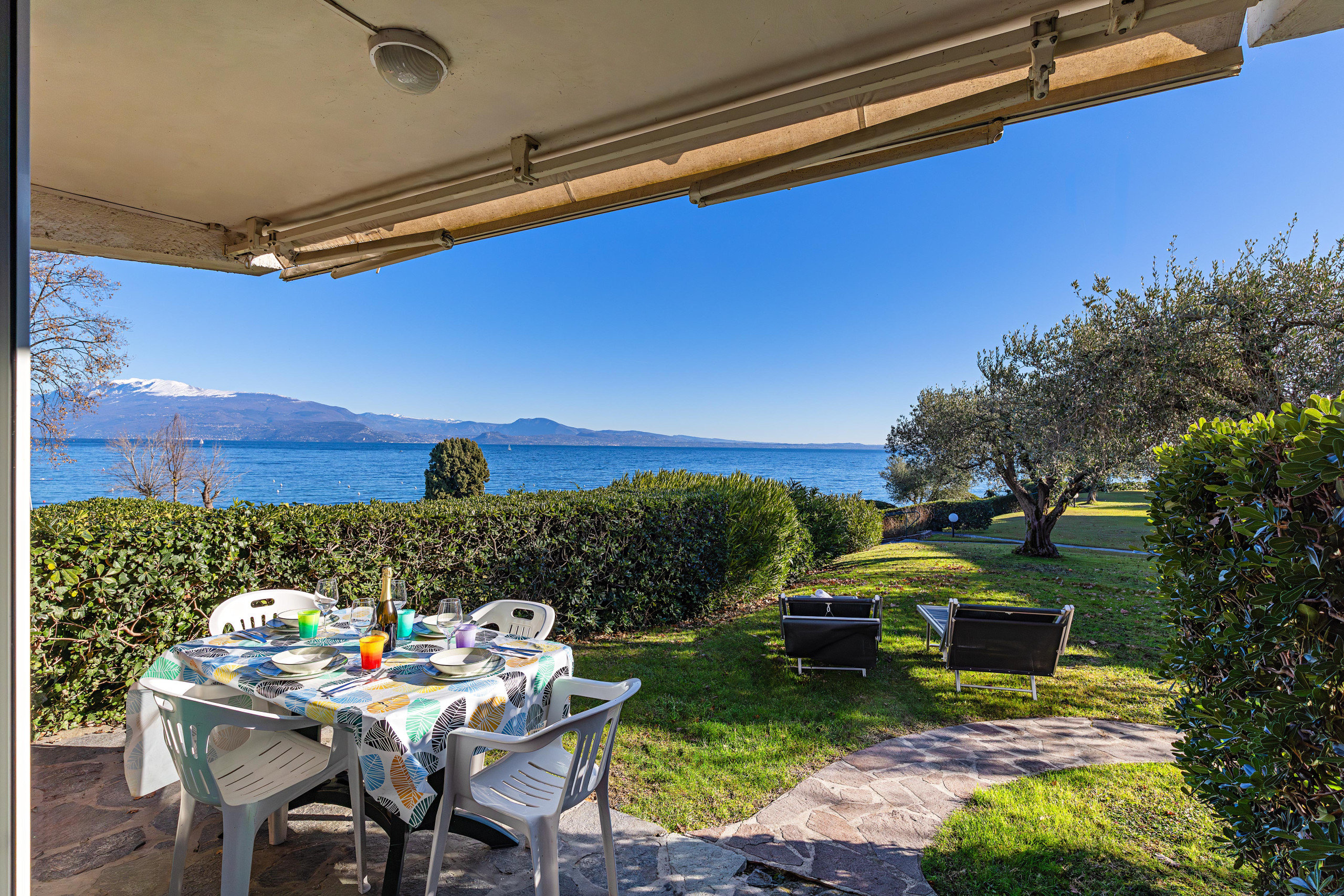 El salón se abre a un bonito patio cubierto por un toldo y al jardín, desde donde se disfruta de una magnífica vista del lago; el patio está equipado con mesa de comedor y sillas de exterior. El apartamento continúa con un dormitorio doble, un segundo dormitorio con dos literas y un baño con ducha, lavabo, bidé, WC y lavadora.