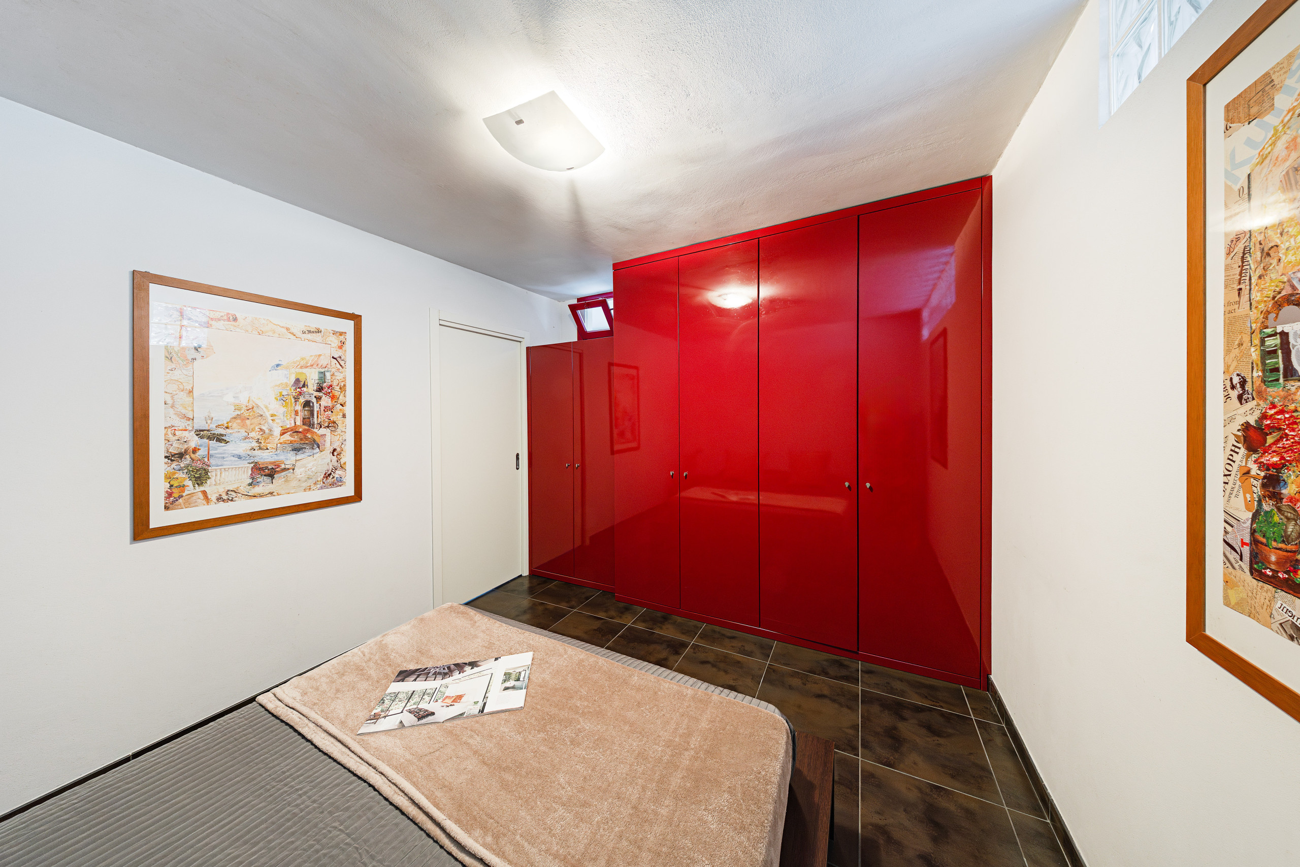 La zona de noche incluye un amplio dormitorio doble con armario (accesible mediante tres escalones), un segundo dormitorio con litera y un baño completo con ducha, lavabo, bidé y WC. Los huéspedes también disponen de lavadora, tabla y plancha. El apartamento incluye un garaje privado para un coche.