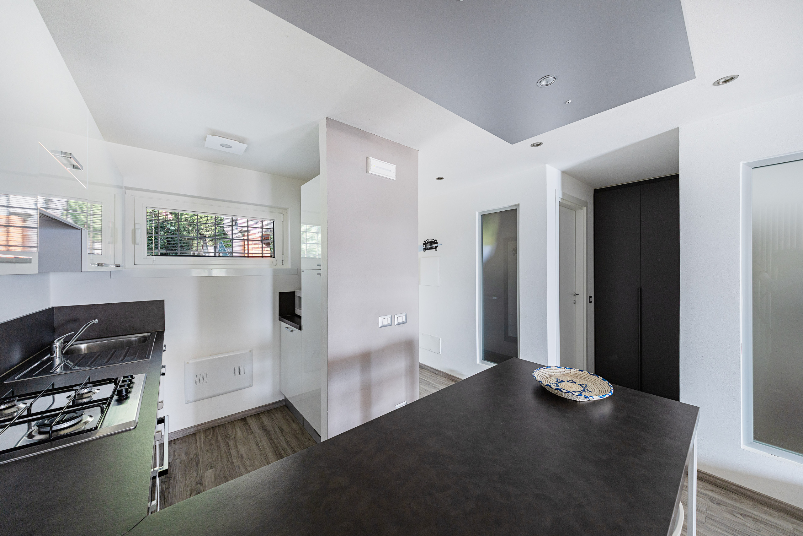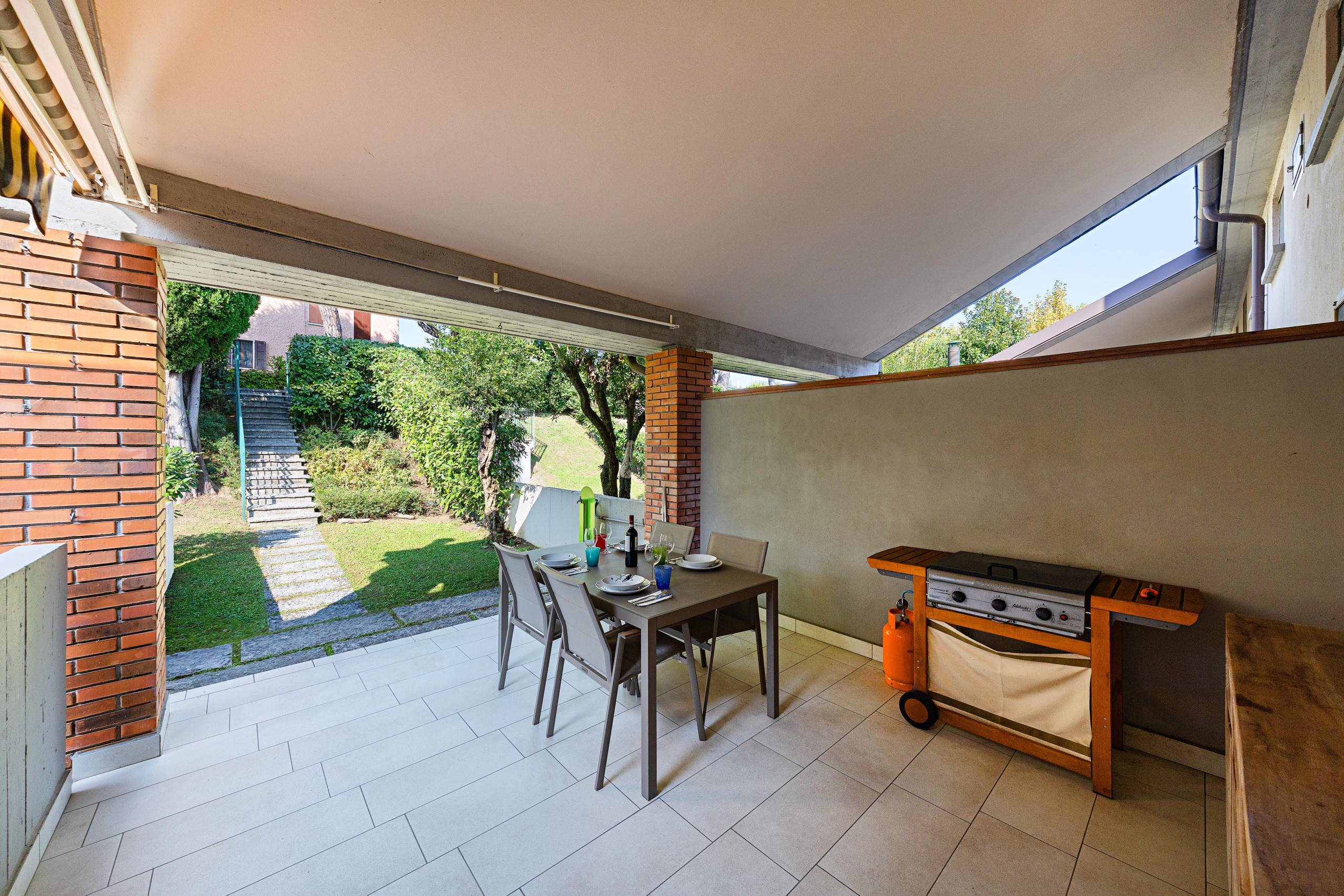 El apartamento, equipado con conexión Wi-Fi gratuita, recibe a los huéspedes con un amplio y luminoso salón con sofá cómodo, mesa de comedor con sillas, Smart TV y cocina americana equipada con nevera, congelador, horno, microondas, lavavajillas, hervidor eléctrico, exprimidor, cafetera americana y tostadora. Desde el salón se accede a la terraza privada, amueblada con mesa de comedor para disfrutar de comidas al aire libre con vistas al lago.