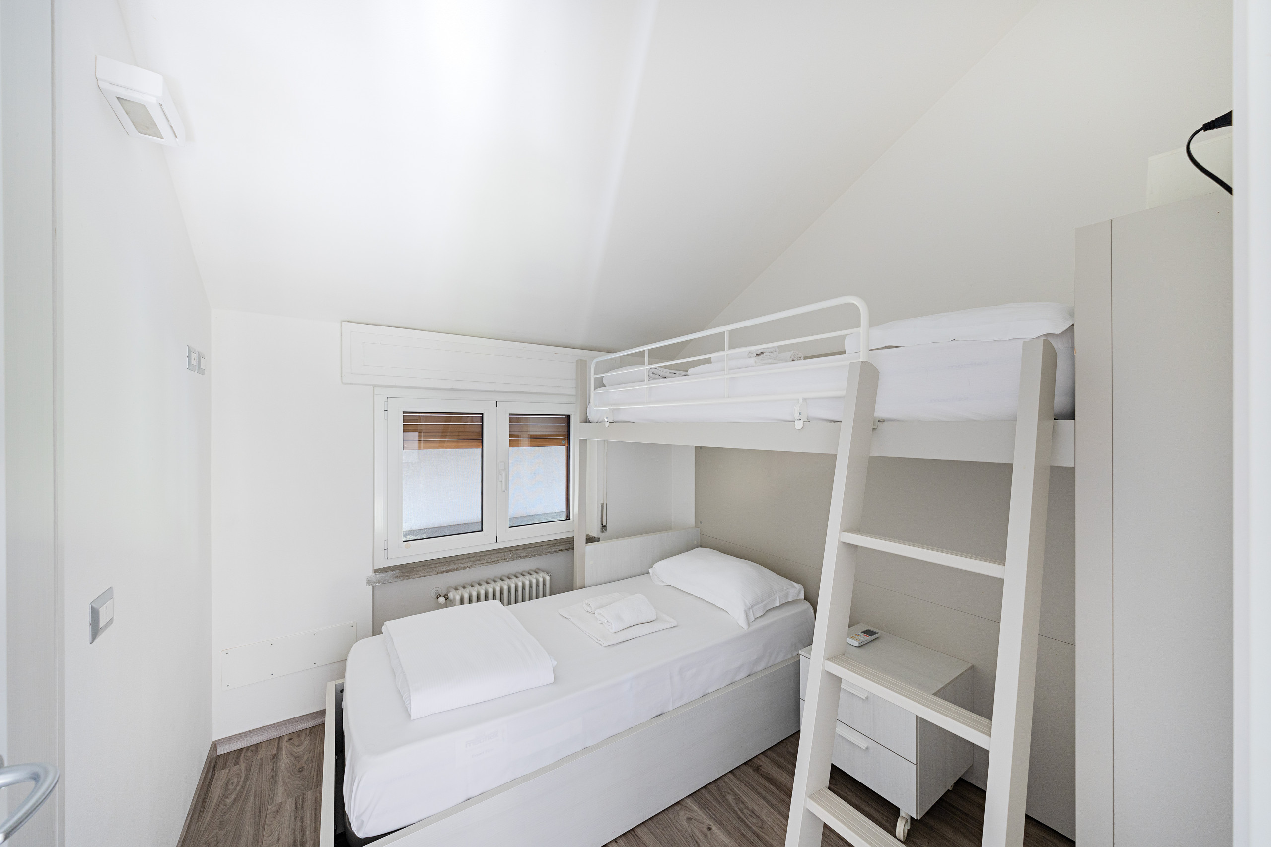 Una escalera interior conduce a la zona de noche, compuesta por dos dormitorios y un baño con ducha, lavabo, bidé y WC. El primer dormitorio tiene cama doble, mientras que el segundo dispone de litera. Ambos dormitorios cuentan con aire acondicionado, armario y vistas al jardín privado.