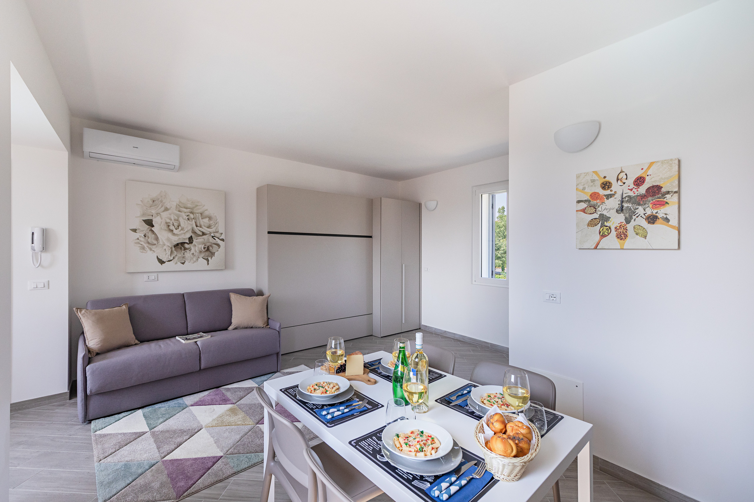 El apartamento, equipado con Wi-Fi gratuito y aire acondicionado, presenta una decoración moderna y encantadora. La zona de estar incluye un cómodo sofá cama doble abatible y un sofá convertible que puede transformarse en una cama doble adicional, un televisor Smart TV de pantalla plana y una mesa de comedor con sillas.
