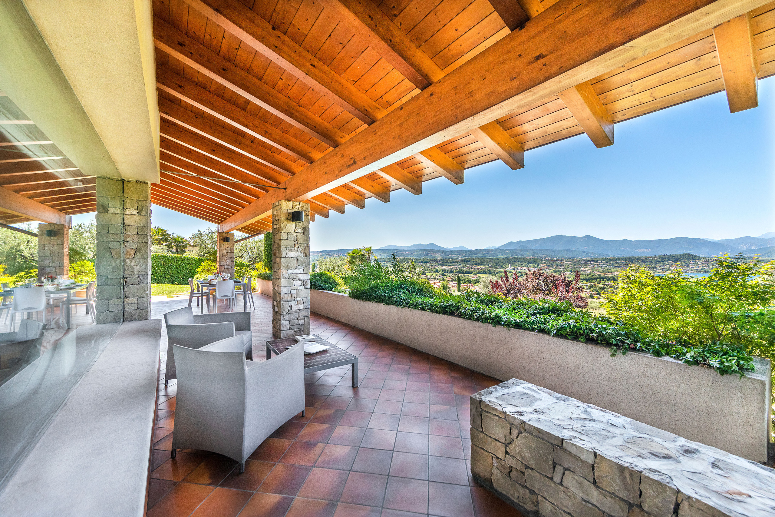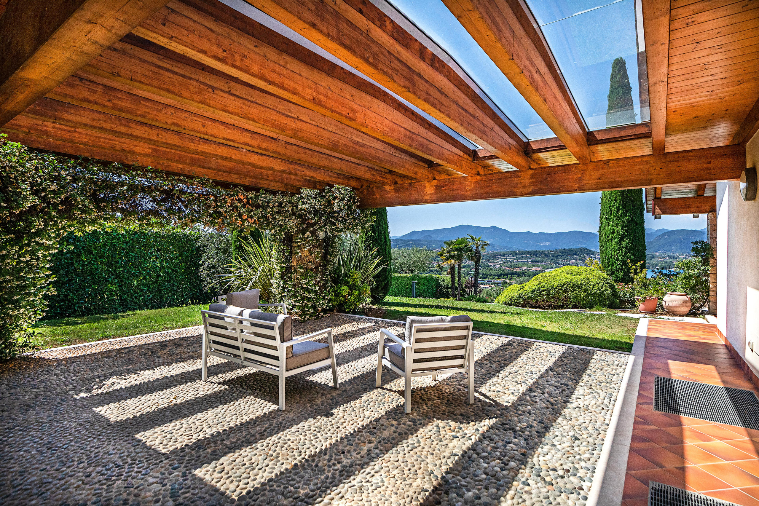 A través de una puerta acristalada, el salón da acceso a un bonito patio cubierto que incluye una pequeña zona de relax con sofás y una mesa de comedor con sillas para desayunos y cenas al aire libre, desde donde se puede disfrutar de una espléndida vista al lago.