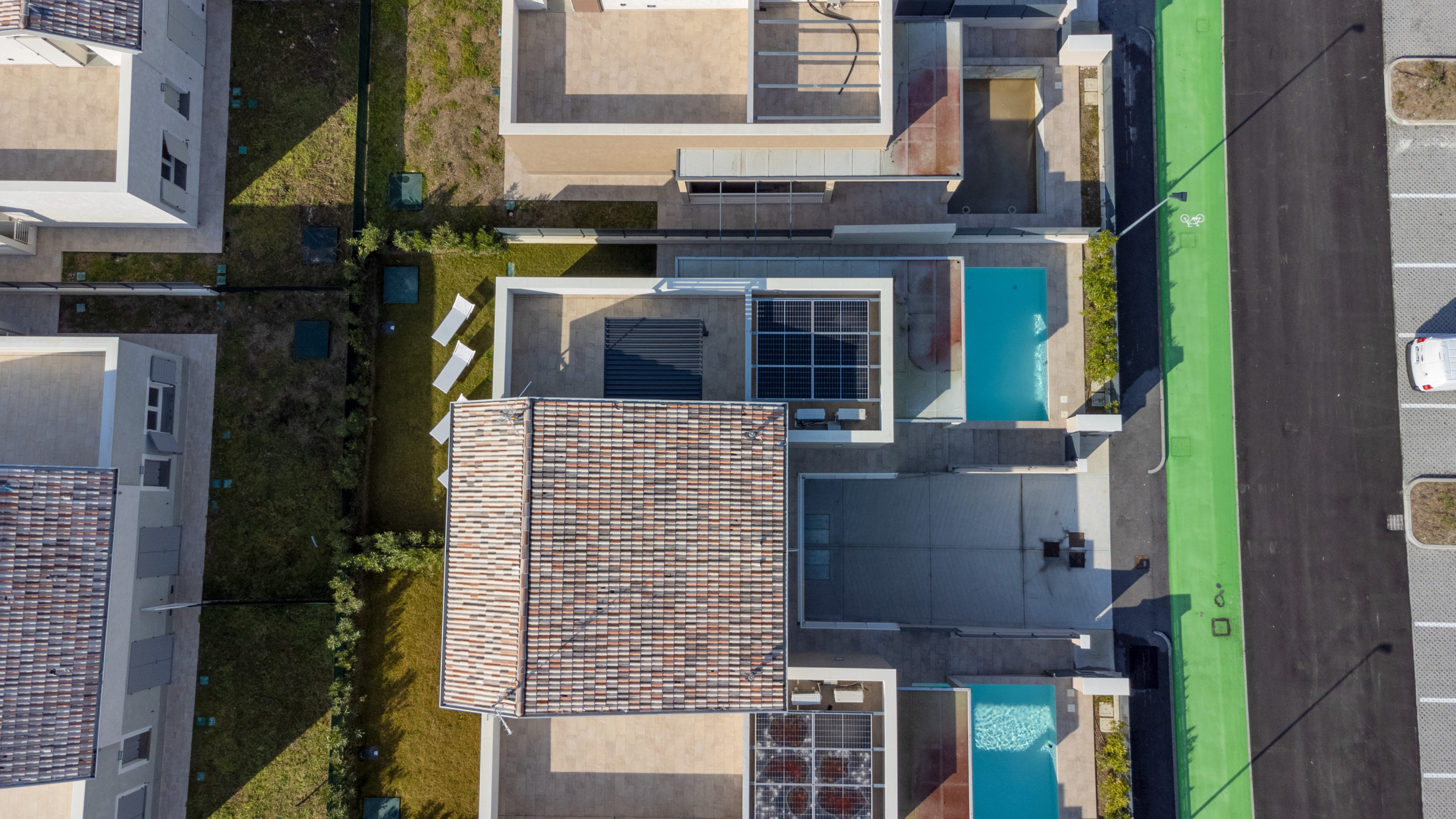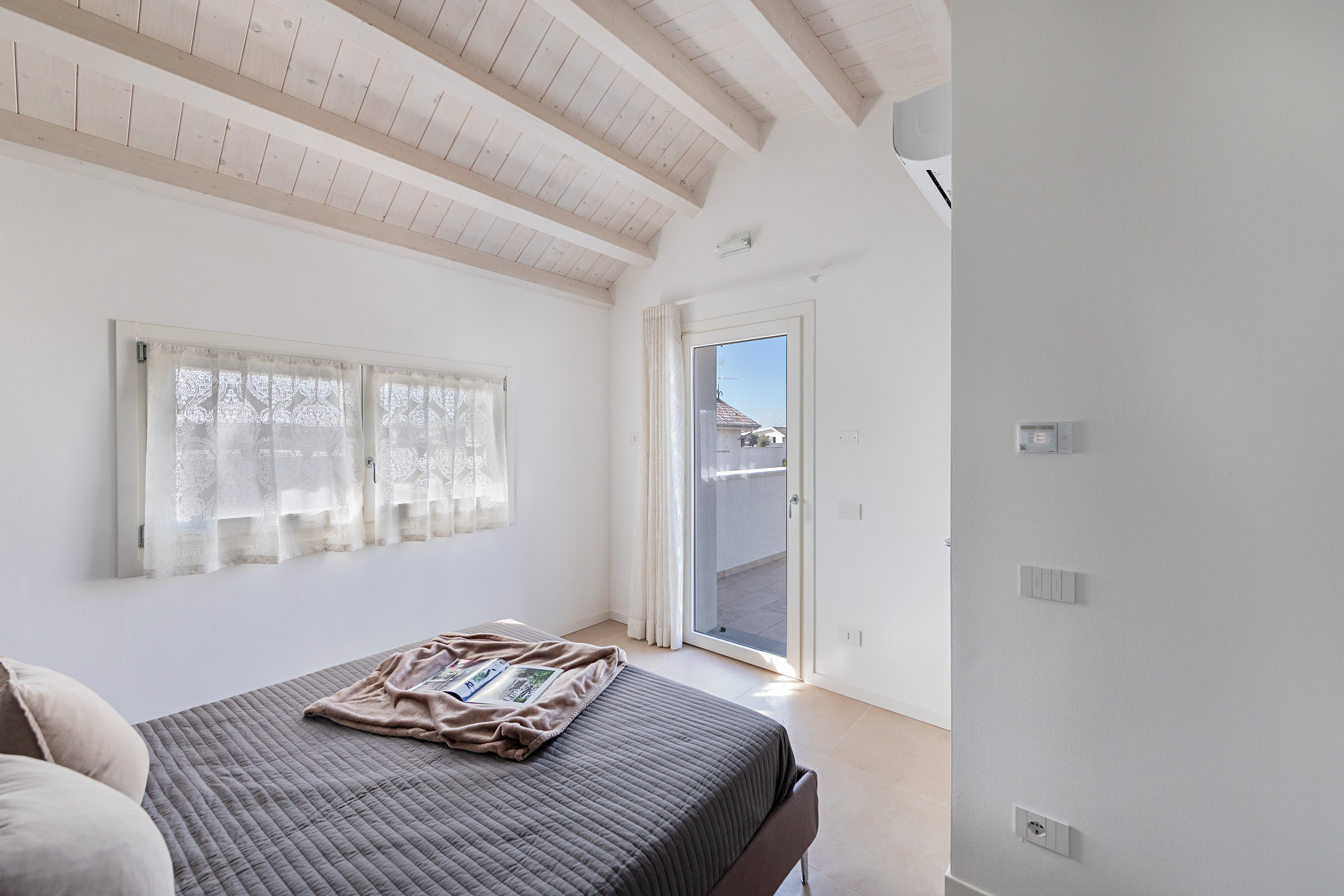 La zona de noche consta de tres dormitorios. La suite principal dispone de cama doble, amplio armario y baño privado con ducha. El segundo dormitorio también ofrece una cama doble y un armario, y tiene acceso al baño de la planta baja, equipado con ducha, lavabo, bidé y WC. En la planta superior se encuentra el tercer dormitorio doble, con vestidor, baño en suite con ducha y acceso directo a la terraza solárium privada de la villa.