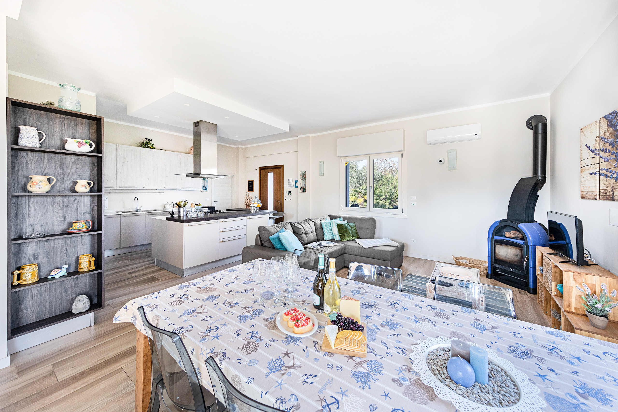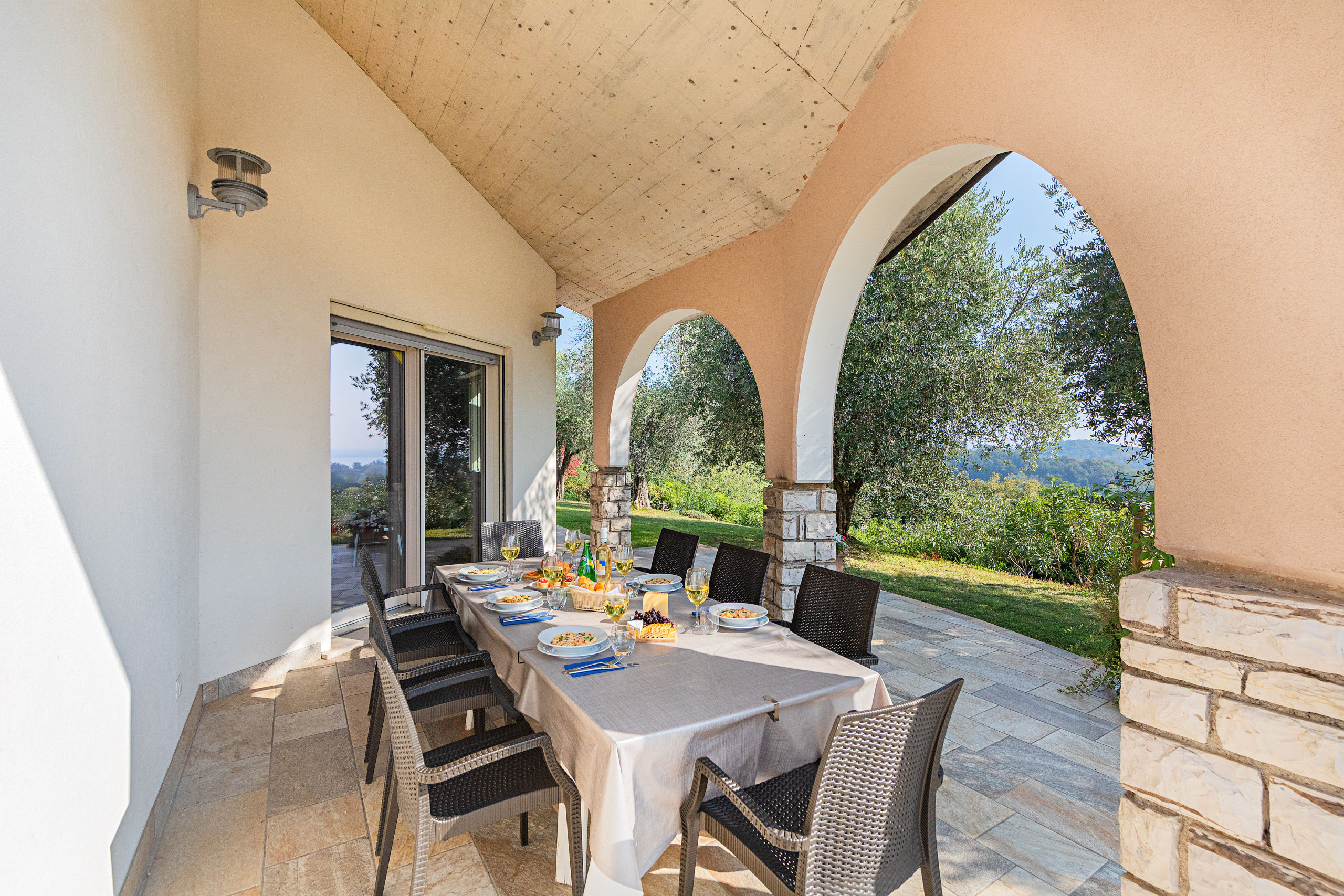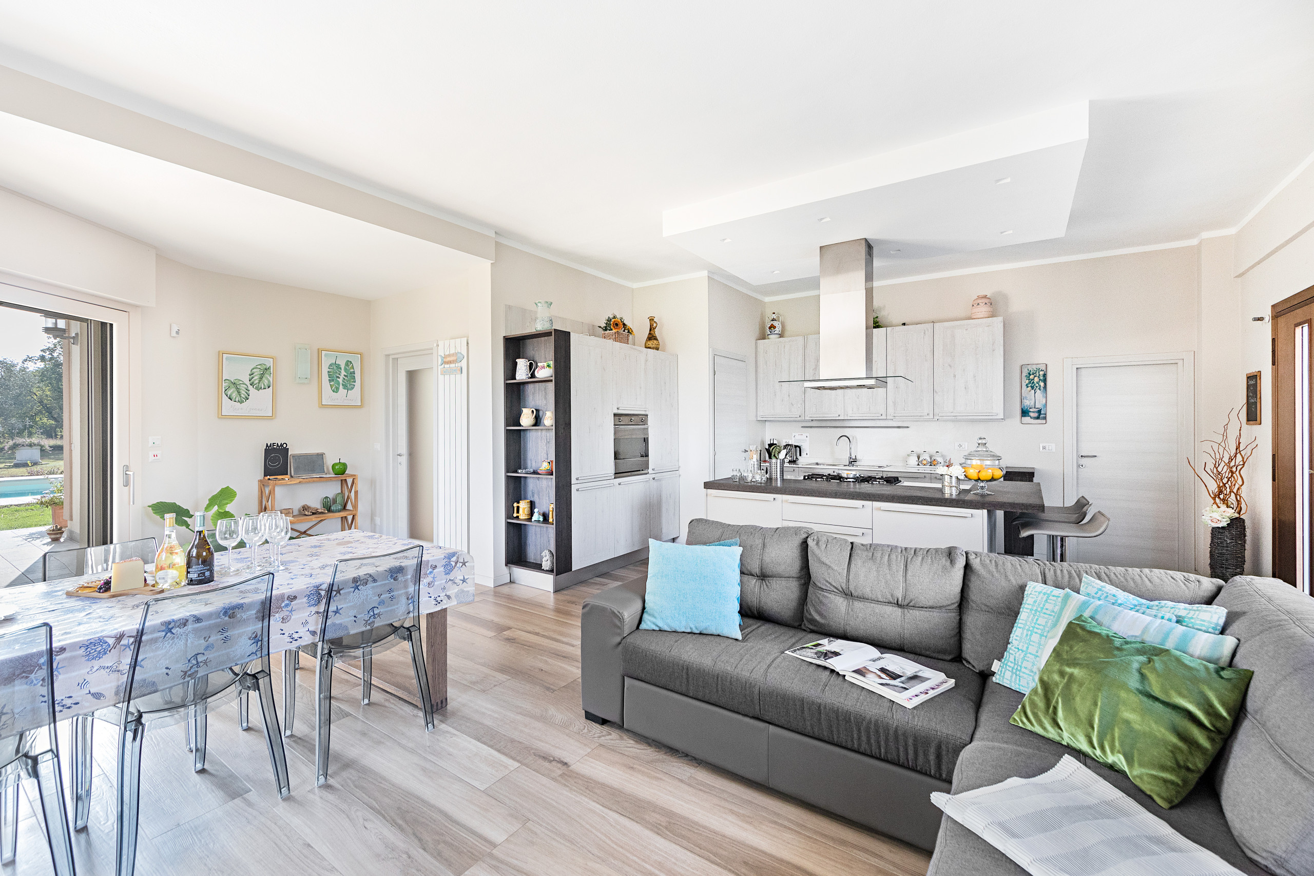 Al entrar, los huéspedes son recibidos por un salón amplio y luminoso, equipado con sofá cama doble, TV vía satélite con canales internacionales, zona de comedor y una cocina moderna completamente equipada: cocina de gas, frigorífico con congelador, horno tradicional y microondas, lavavajillas, hervidor, exprimidor, cafetera y tostadora. La villa permite comer cómodamente tanto en el interior como en el exterior, gracias a la mesa interior y a la zona de comedor bajo el pórtico cubierto, desde donde se puede admirar la piscina, el jardín y el panorama del lago.
